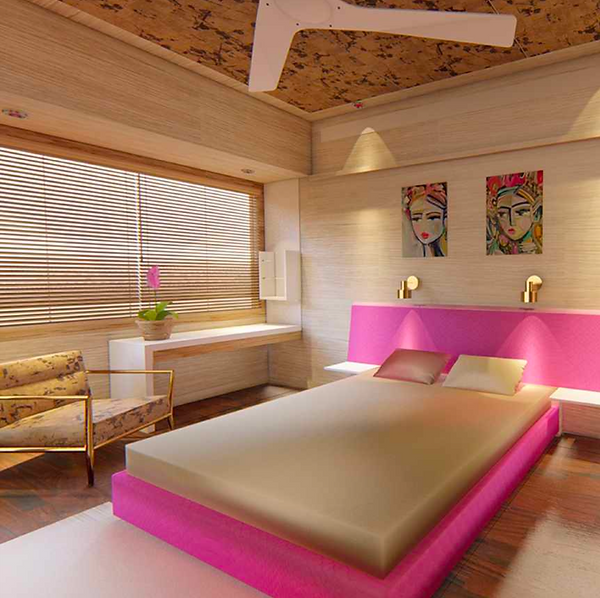 Interior design for a residence located in Bangalore. Th usage of pink leather headboards and gold fitting around the room provides the perfect balance between playful and elegant.